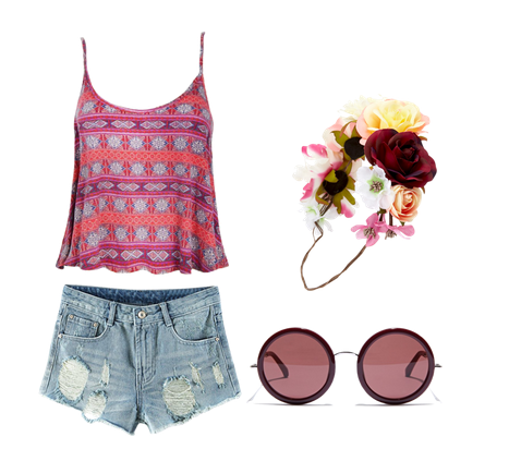 Óculos de sol redondo, uma coroa de flores na cabeça, short jeans e blusa bem colorida!